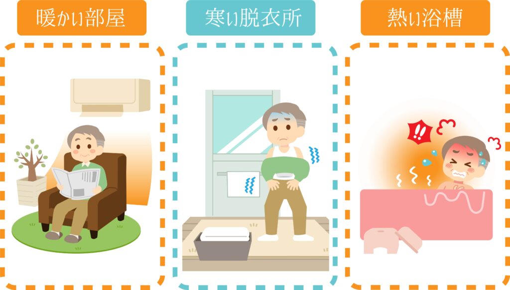 浴室で事故が多く発生する原因の1つに、寒暖差によって引き起こされる「ヒートショック」があります。ヒートショックとは、暖かい部屋から寒い脱衣場に移動し、さらに熱い浴槽に急に入ることで引き起こされる循環器系の疾患のこと。めまいや失神をはじめ、症状が重いと脳内出血や心筋梗塞のリスクもあります。ヒートショックは入浴時の温度差によって起こる、急激な血圧の変動が主な原因です。