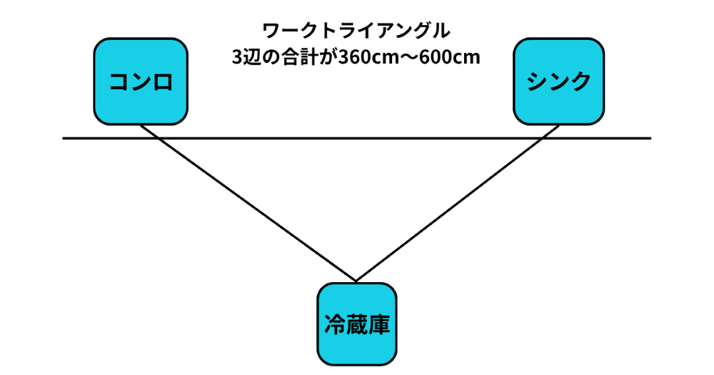 キッチンには「ワークトライアングル」という基本的な考え方があり、冷蔵庫・シンク・コンロを結ぶ3辺の合計が、360cm〜600cmの範囲に収まると使いやすいとされています。どのくらいのスペースを確保するか迷ったときは、このワークトライアングルを参考に配置を考えてみましょう。