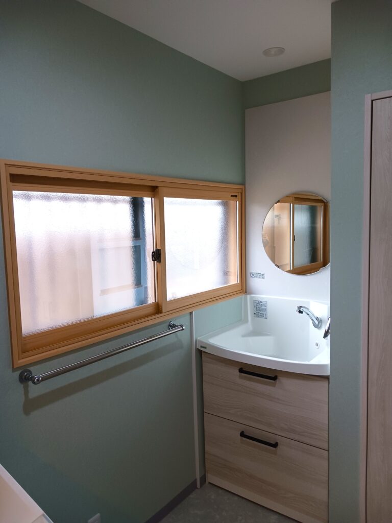 鏡はマグネットパネルと丸型ミラーを別の洗面化粧台からの組み合わせでお取り付けしております