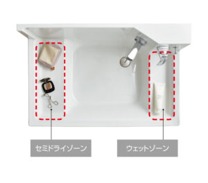 一時置きに便利なウェットゾーン 間口90センチにはセミドライゾーン 仮置きの場に