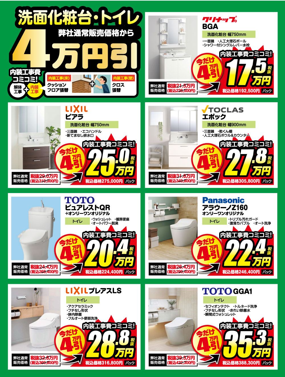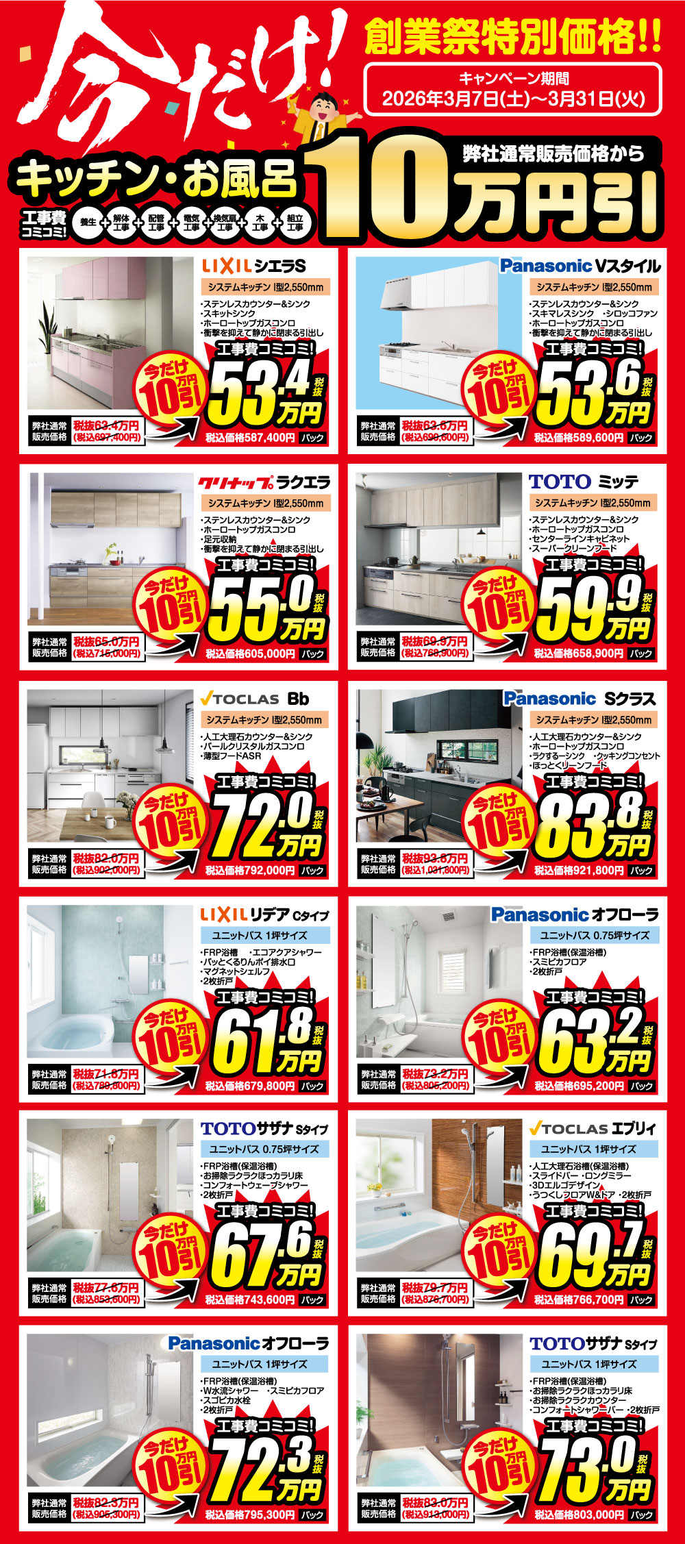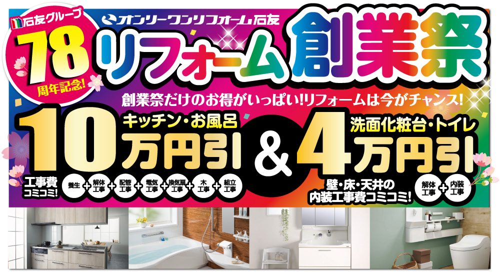 ※掲載の価格は、2026年3月7日(土)〜31日(火)の期間中に新規お見積依頼をいただき、2026年4月30日(木)までにリフォームをご成約いただいた方対象。※別途工事費が必要となる場合がございます。※2026年3月6日(金)時点で既に弊社とリフォーム請負契約を締結済の方は対象外とさせていただきます。キャンセル後の再契約も不可とします。※掲載価格は予告なく変更される場合がございます。※詳細はスタッフまでお尋ねください。