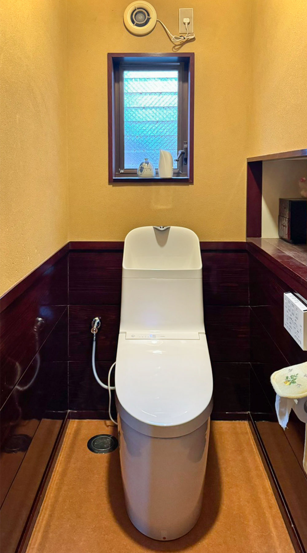 既存の漆塗りの壁は残し、床をクッションフロアにて貼替え。トイレも以前よりお掃除しやすく、ご夫婦即決のもので交換しました。